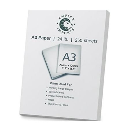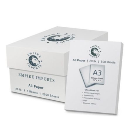 Empire Imports A3 paper is a specialty sized paper that has a wide variety of uses. This paper is made from premium quality 24 lb. Stock, and is good for professional quality projects and casual ones alike. A3 paper can be used for many purposes like large images, spreadsheets, maps and other large landscape-style needs. It also can be used for print jobs requiring a spread of two A4 sheets. Each ream contains 250 sheets.