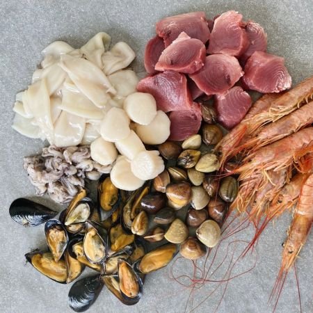 Paella Box Seafood Platter Prawns, Clams, Scallops, Mussels, Squid, Tuna, We source Premium fish, all our fish is individually caught using pole and line fishing methods.